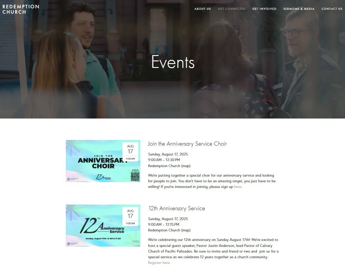 When you run a church, you'll have a lot of different events to promote. We love how Redemption Church has organised its events page.