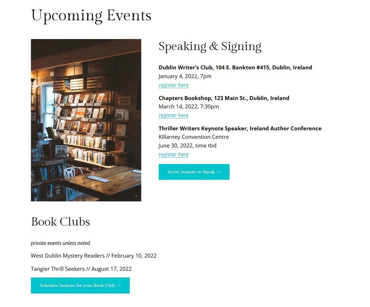 Designed for authors, the Idyll events template is eye-catching but minimalist, ideal if you only have a handful of events to promote.